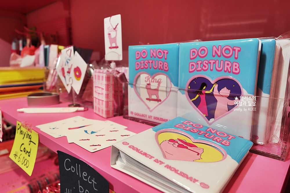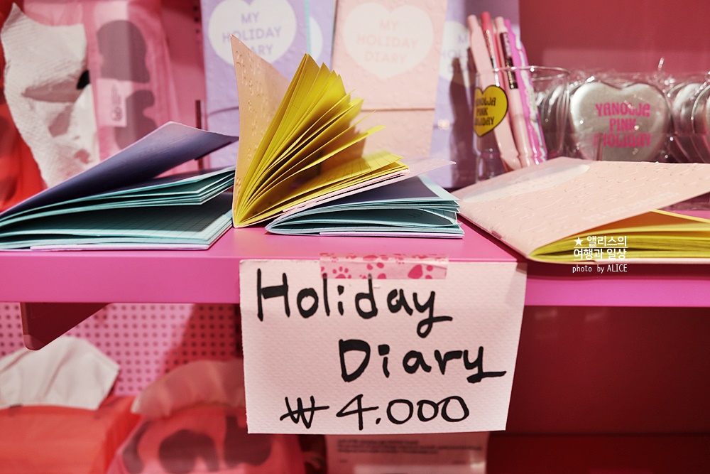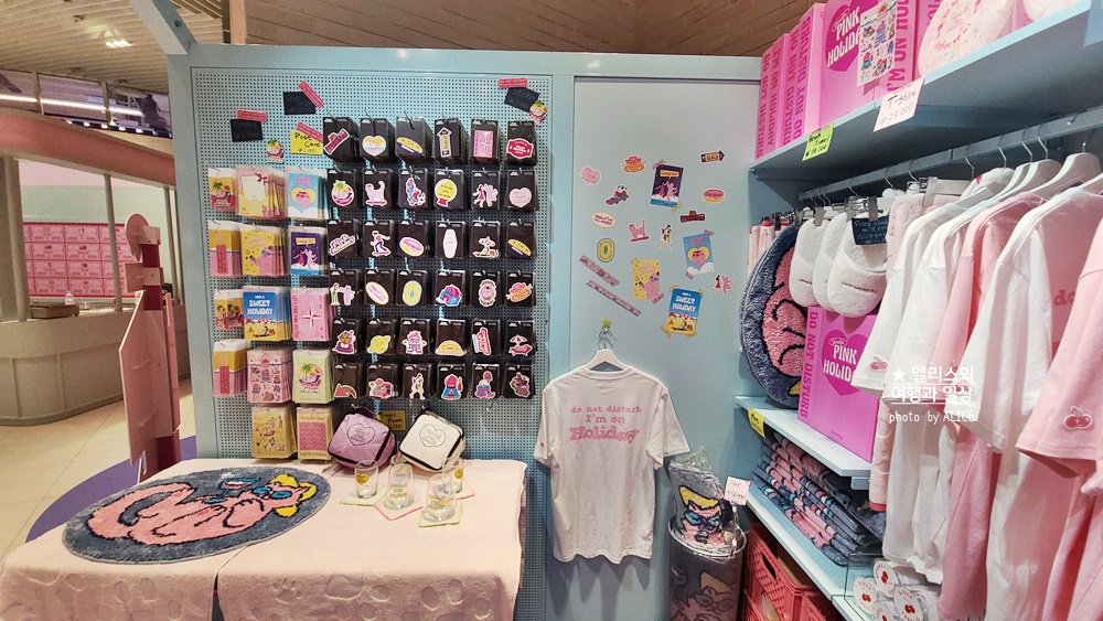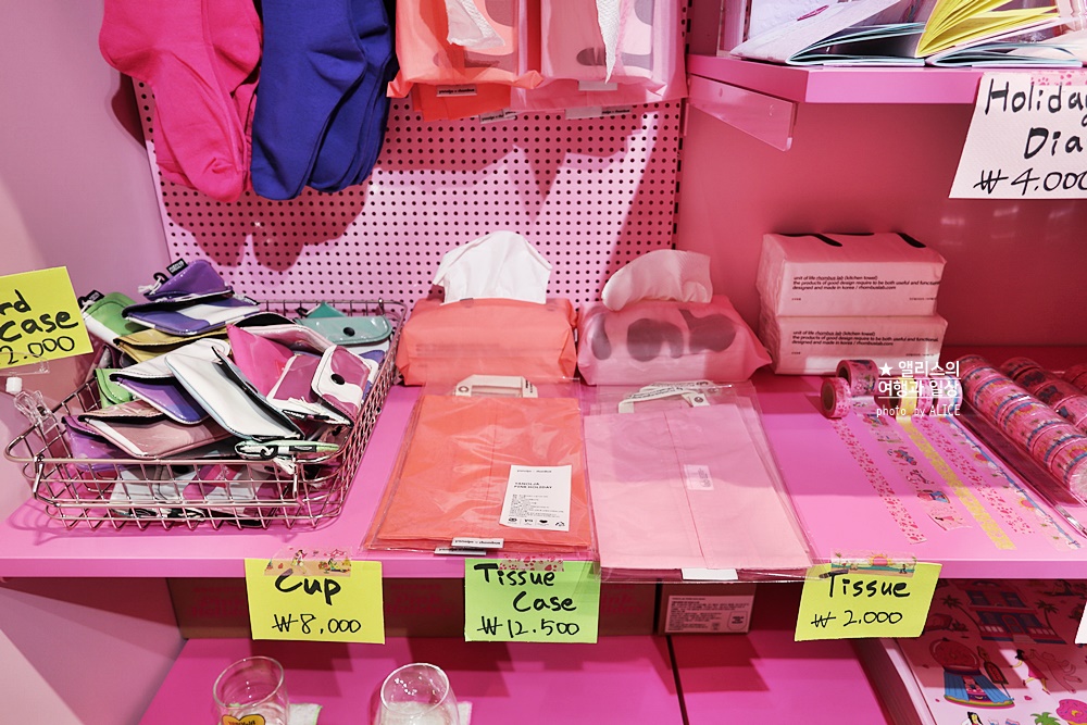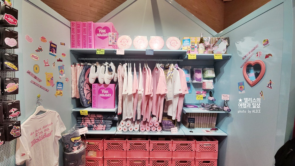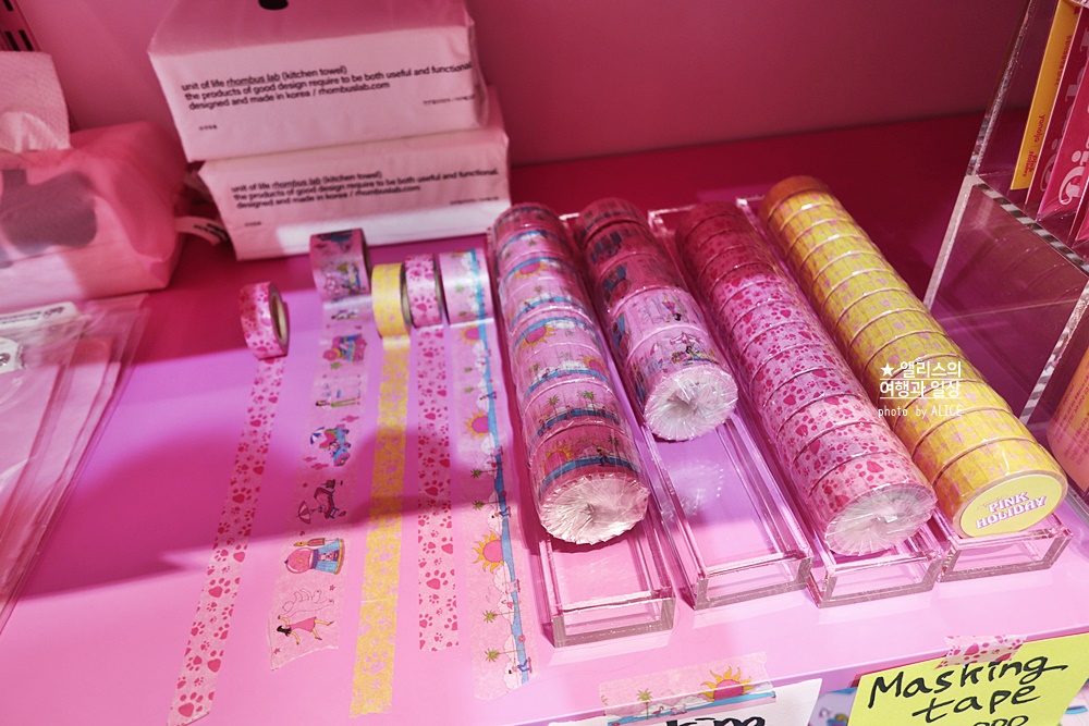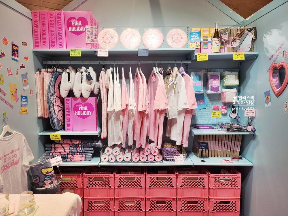 키르시와 콜라보 티셔츠와 거울, TWB의 배스타월과 코스터, 서프 코드의 서핑보드, 스케이트까지 볼 수 있는 핑크 홀리데이 굿즈 스토어다. 볼 수록 막 사고 싶은 생각이 들었지만 정작 나에게 필요한 것은 없어서 조금 아쉬웠다. 스케쥴러가 필요했던 찰나 몇 개의 제품을 봤지만 내 취향에 쏙 마음에 드는 것은 없어서 살짝 아쉬웠다. 하지만 한 때 다꾸에 빠졌던 나로서는 마스킹 테이프와 같은 문구용품은 눈길을 끌긴 했다. 아마 지금도 다꾸를 계속했다면 몇개의 마스킹 테이프를 샀을지도 모르겠다. 다른 곳에서 쉽게 구매하기 어려운 굿즈들도 있어서 평소에 관심 있던 사람들이라면 아마도 몇 개의 아이템을 구매할 수 있을 것 같다.