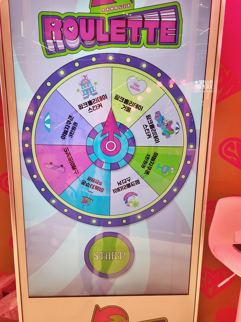 서프코드 스케이트보드, 야놀자 숙박할인권, 거울, 스티커 등이 선물로 기다리고 있는 룰렛 이벤트다. 야놀자 팝업스토어에 입장하는 이라면 누구나 한 번의 기회가 주어진다. 물론 가장 많이 걸리는 경품은 야놀자 스티커(굿즈)다. 내가 있는 동안 모든 사람이 야놀자 스티커에 당첨되었다. 다른 것에 당첨되는 사람은 못 봤음.