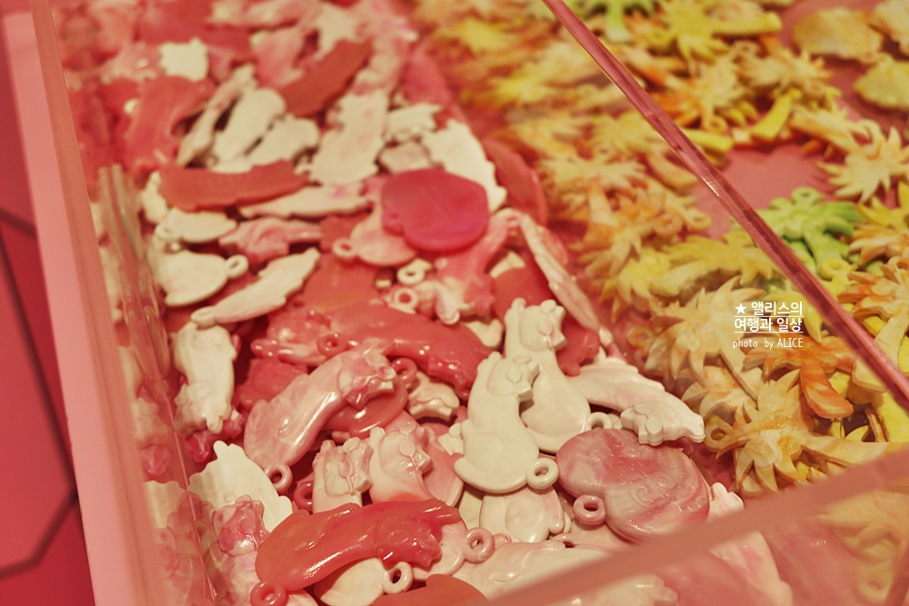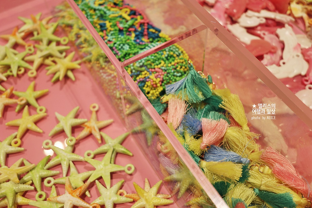 버려지는 플라스틱을 재활용해서 만든 장식들이 모여있다. 이 장식들을 이용해서 자신만의 스타일을 담아 키링을 만들 수 있다. 종류가 생각보다 다양해서 직접 만들어보는 재미가 쏠쏠하다.
