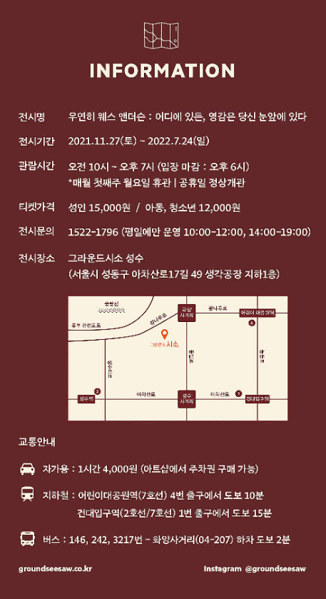 국내 '우연히 웨스 앤더슨' 전시는 그라운드 시소 성수에서 열렸다. 내가 머무는 호텔에서 다소 멀었지만 이번만큼은 꼭 관람하리라 싶어 지하철을 타고 (다행히 지하철 환승 없이 바로 이동 가능) 성수역으로 향했다. 성수역에서 도보 이동 가능하지만 귀찮다면 택시 타거나 마을버스를 이용하면 더 쉽게 도착할 수 있다.
