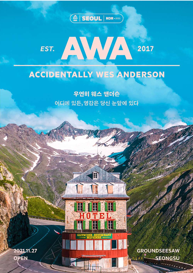 우연히 웨스 앤더슨 전시의 모티브가 되는 웨스 앤더슨 감독의 11번째 영화인 "프렌치 디스패치" 그 영화가 촬영된 프랑스 앙굴렘. 그곳에서 AWA 팀은 실제 영화 장면을 발굴해내기 위해 앙굴렘에 방문했다. 그들은 필요한 장소를 조사하고 이에 필요한 자료들을 찾으면서 그들의 호기심을 채울 수 있는, 실제 영화 장면을 찾아내기 위한 과정을 영상으로 이렇게 남겼다.