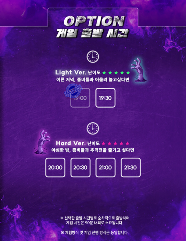 · 하드버전 (야심한 밤, 좀비들과 추격전을 즐기고 싶다면): 20:00, 20:30, 21:00, 21:30