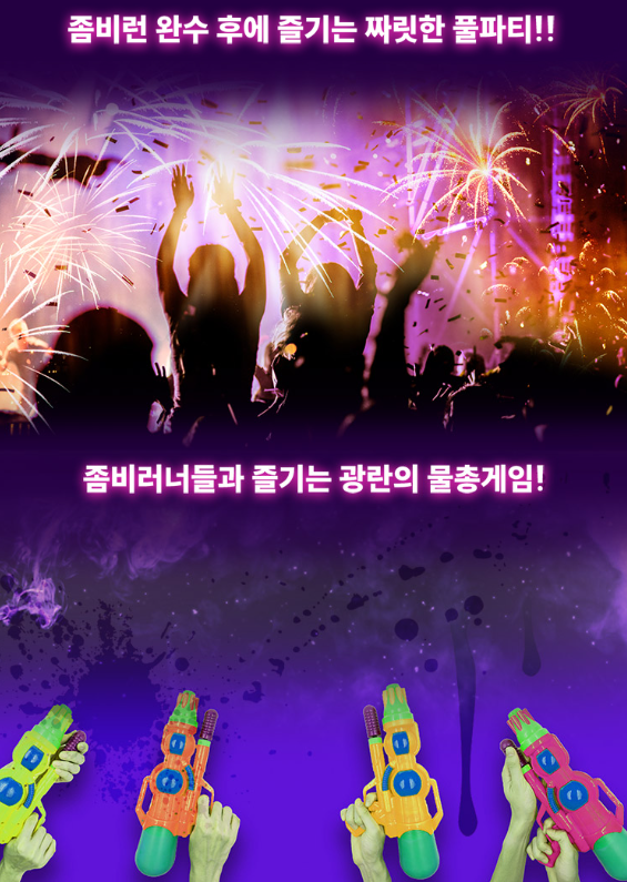 A. 체험은 크게 좀비런 코스+어트랙션 탑승+풀파티(물총게임)로 이루어지며, 당일 좀비런 러너들만을 위한 워터파크의 일부 구역에서 진행된다. 좀비런 체험 전 워터파크를 이용하고 싶은 러너들은 별도로 주간 워터파크 티켓을 구매해야 한다.