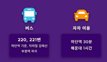 ③ 지하철: 하단역 기준, 지하철 김해선 부원역 하차 이후 셔틀버스 탑승 추천