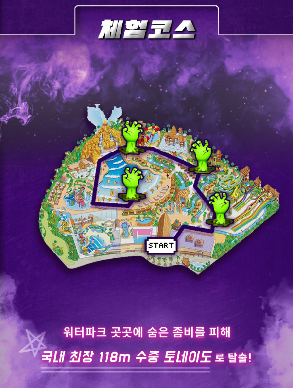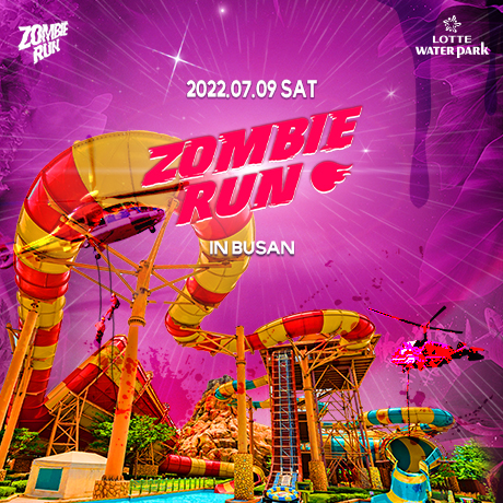 최초 특별 여름 시즌에 즐기는 좀비런! 국내 최대규모의 워터파크에서 즐기는 이색적인 좀비런 액티비티다. 팀제로 운영되며 새로운 사람들과도 친해질 수 있는 기회이기도 한 좀비런 부산. 물론 혼자와도 좋고 함께와도 좋다. 워터파크 곳곳에 숨은 좀비를 피해 국내 최장 118M 수중 토네이도로 탈출하는 목표가 명확한 액티비티이기 때문에 합심하여 좀비를 피해 탈출하며 여름 더위를 잊는 즐거운 볼거리이자 즐길거리다.
