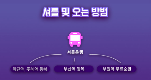 · 하단역,주례역,부산역 셔틀버스 이용은 6,000원(티켓5,000원+수수료1,000원)으로 티켓 구매시 선택구매가능