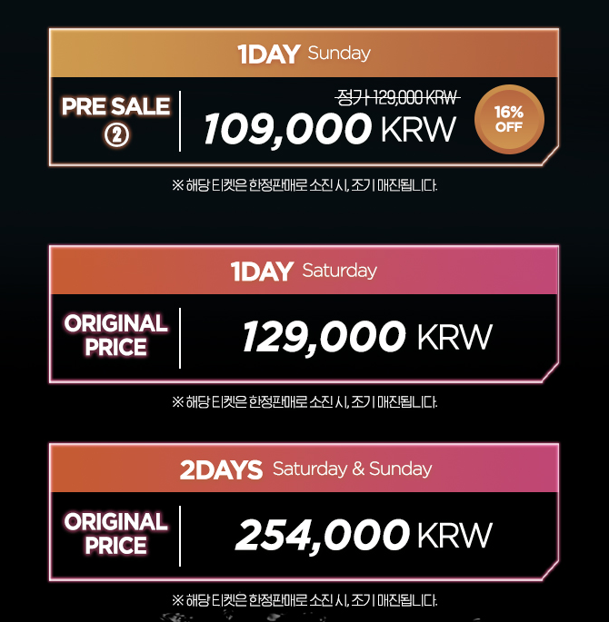 * 프리세일(얼리버드 할인가)는 모두 매진된 상태. 현재 정가 입장권은 예매 가능하다.