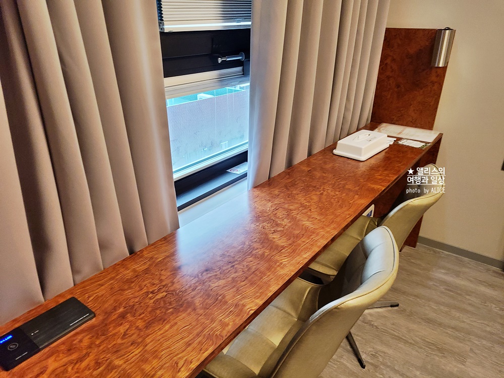 책상은 모든 객실이 그러하듯이 길죽한 책상이라 간단한 수납 기능은 물론 책상으로서의 역할도 동시에 하고 있다. 책상의 적당한 세로 길이에 길쭉한 가로 덕분에 노트북을 두고 작업해도 여유공간이 충분히 나왔고 다른 짐을 두기에도 편리했다. 책상 바로 끝에는 음료 냉장고와 간단한 티메이커가 있다.