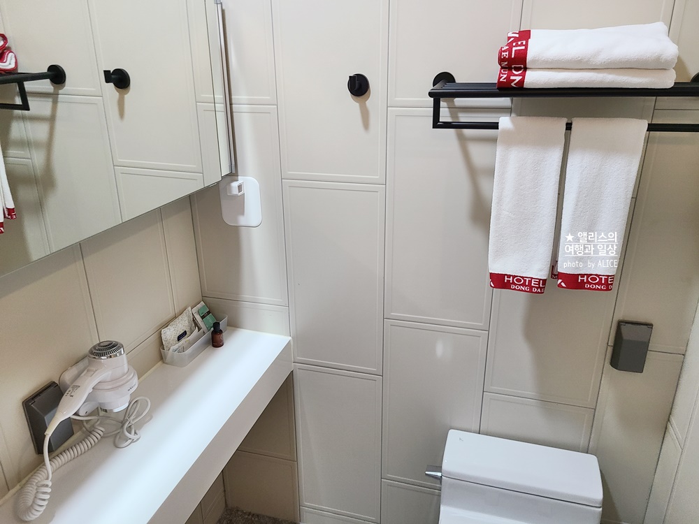 생각보다 공간이 좁지 않았고 세면대와 별도로 짐을 둘 수 있는 선반공간과, 거울을 활용하면서 동시에 수납공간이 있어서 이용하기에 편리했다.
