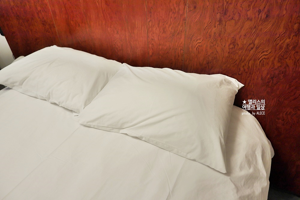 침대는 깔끔하게 하얀색 이불로 정리된, 이불 세팅은 가볍게 이불을 얹어놓은 상태. 개인적으로 매트리스 안으로 단단하게 이불을 세팅하는 것도 보기는 좋으나 어차피 이불을 꺼내 쓰는 내 입장에서는 이불을 얹는 세팅을 좋아한다. 그런 점에서 이런 이불 세팅이 마음에 들었고, 이불 자체도 가볍지만 얇아서 잘 때도 답답하지 않게 잘 수 있었다.