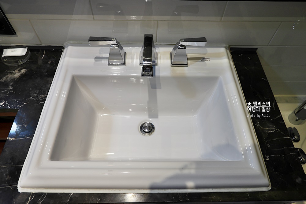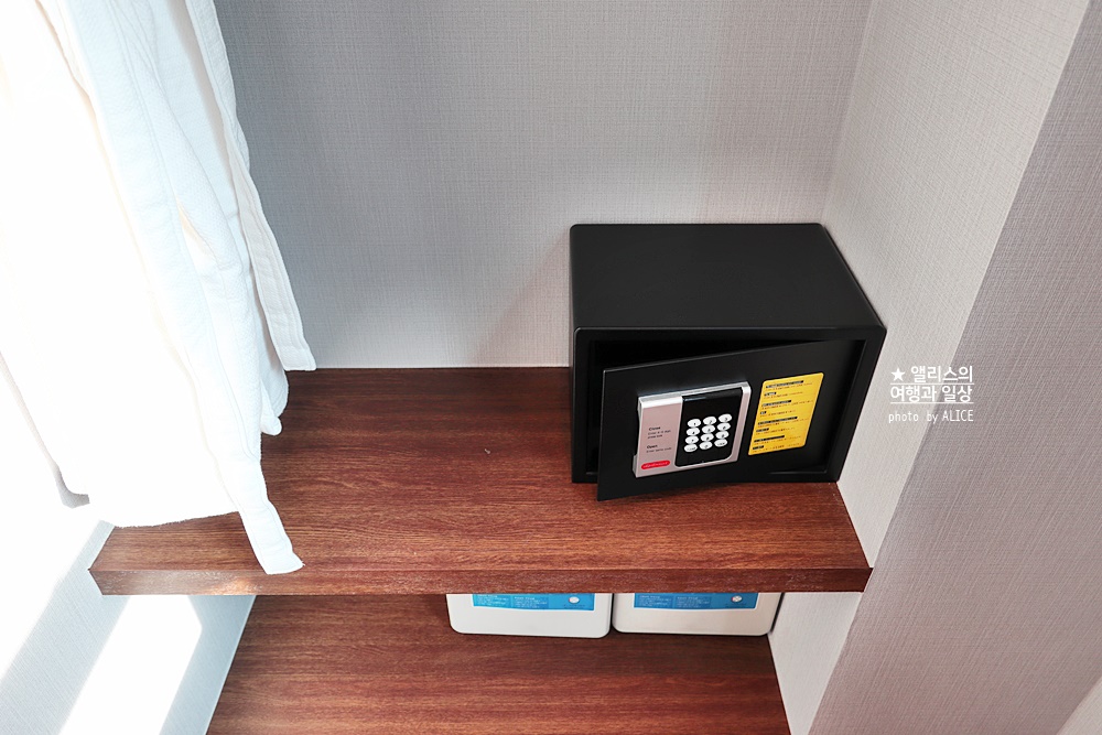 세면대는 넓진 않아도 깊은 형태라 오히려 사용하기 편리했고 세면대 왼쪽에 별도의 수납공간이 있어 개인 짐을 수납하기 좋았다. 아래 별도로 개인 짐을 수납할 수 있는 원목 수납장이라 개인 옷이나 짐을 둘 수 있다. 수건도 넉넉하게 제공되고 드라이어기랑 3가지 종류도 빗도 갖춰져 있다.