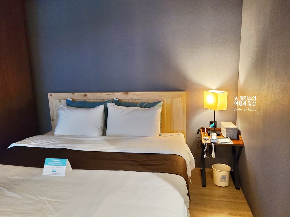 - 구성: 무료 wifi, TV, 생수 2병, 냉장고, 전기주전자, 헤어드라이기, 비누, 샴푸, 컨디셔너, 바디워시, 스킨, 로션, 바디로션, 면도기, 칫솔 2개, 타올, 가운, 면봉, 여성청결제, 폼클렌징, 헤어스프레이, 가운, 객실 슬리퍼