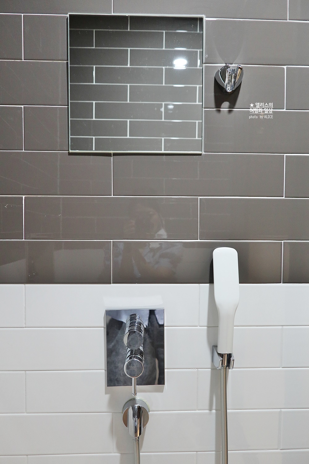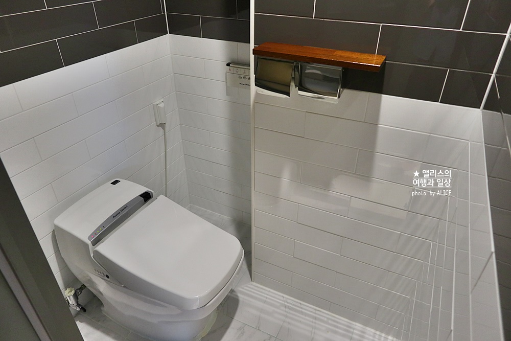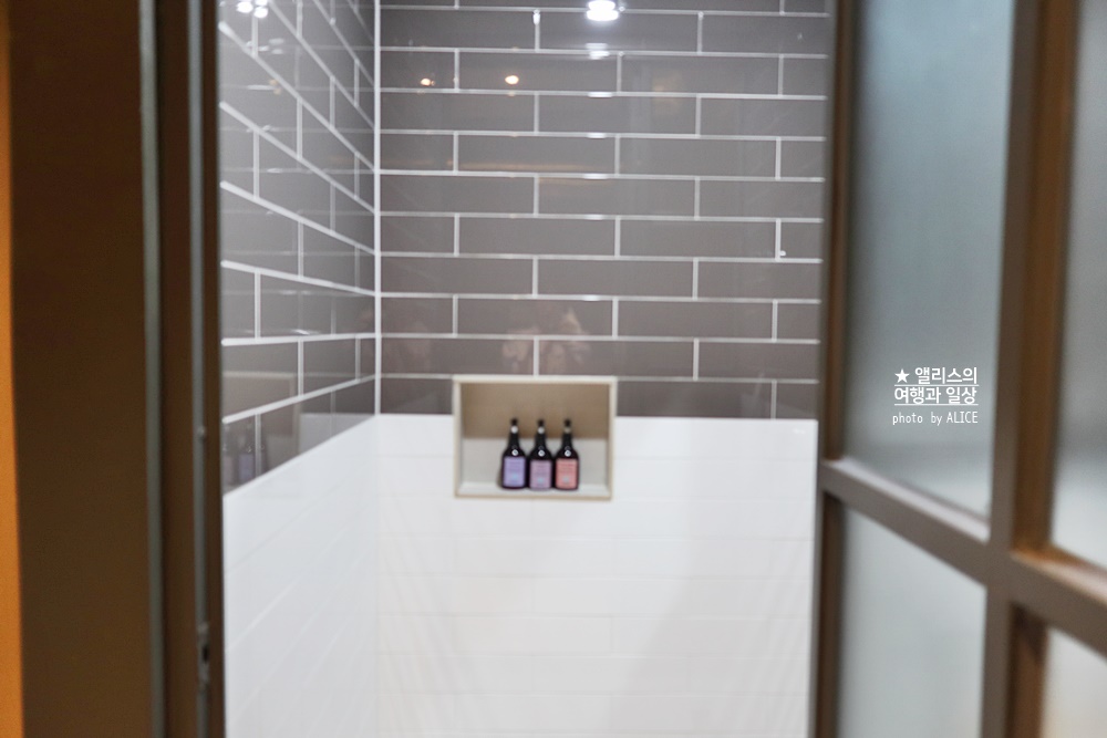 샤워실은 별도의 샤워 문을 여닫고 사용할 수 있다. 내부 공간도 넓다. 별도의 간단한 개인 용품을 둘 수 있는 공간도 있다. 샤워기 수압도 세고, 뜨거운 물도 특별한 지연 없이 잘 나온다. 대용량 어매니티는 샤워실 안에 있으니 참고하자. (샤워타월은 세면대 근처에 있음.)