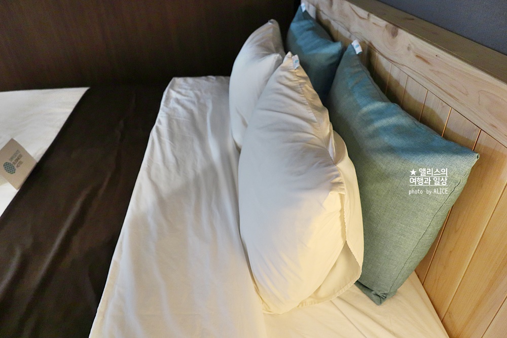 침대는 단단하다는 것. 몸을 잘 받쳐주기 때문에 허리나 척추가 약한 이들이라면 무리 없이 편하게 숙면을 취할 수 있다. 베개는 약간 단단한 편이라 목을 받쳐주는 데 아주 탁월하다.