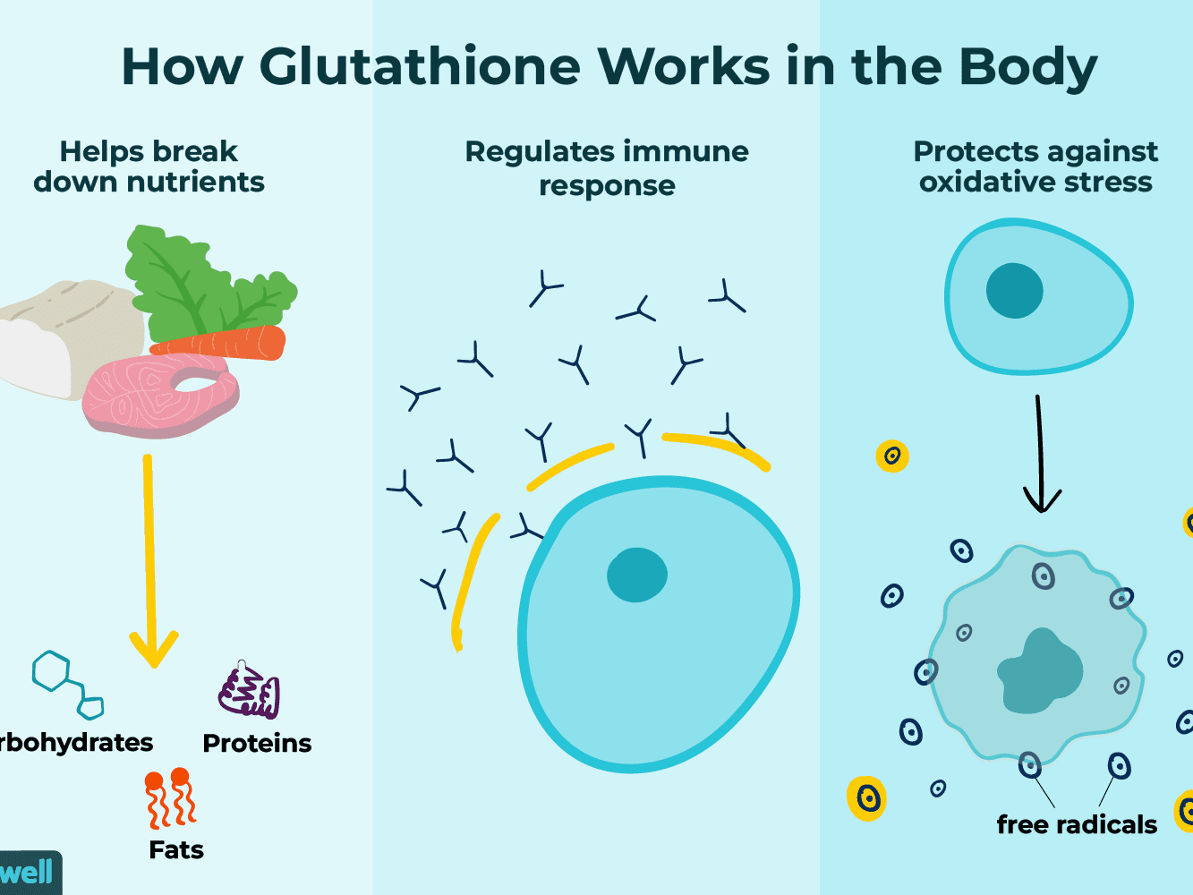 체내에서 가장 효과적인 해독제로 글루타치온은 해로운 독소, 오염 물질, 화학 물질, 중금속 및 약물 대사 산물과 결합하여 소변이나 장을 통해 배설되게 해준다. (그래서 술 많이 마시는 사람들이 글루타치온 섭취를 늘리기도 한다고.)