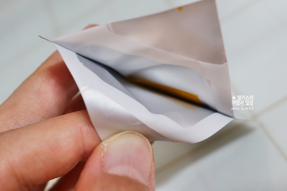 이건 물도 필요 없음. 각 필름지에는 OPEN이라고 적힌 부분이 있는데, 그 부분을 이용하면 쉽게 열 수 있다. 그렇게 필름지를 열면 내부에 직사각형의 말랑말랑한 필름 형태의 글루타치온 고형분이 있다.