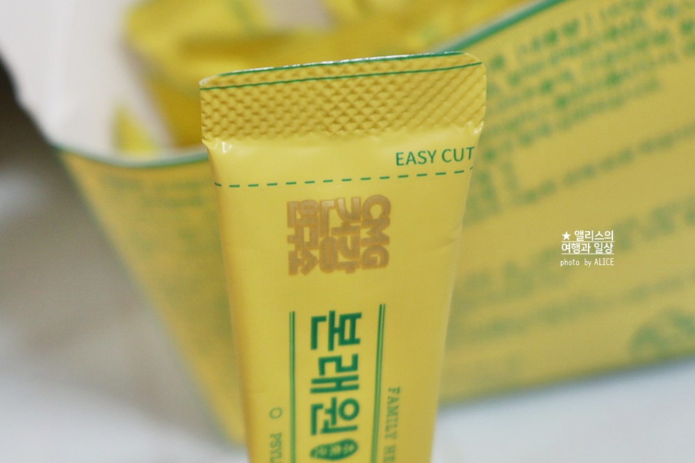 가루보다는 입맛에 영향을 덜 주는 형태의 환으로 된 스틱이라 물과 함께 간편하게 먹기 좋다는 장점이 귀차니즘이 강한 나에게 큰 장점으로 다가왔다. 크기도 크지 않고 하루에 아침저녁으로 총 두포 간편하게 챙겨 먹으면 하루 종일 야외에서 취재하느라 바쁠 때 식이섬유 많은 식단을 꼭 챙겨 먹어야 할 필요를 덜 느낀다. (그만큼 신경을 덜 써도 돼서 편하다.)
