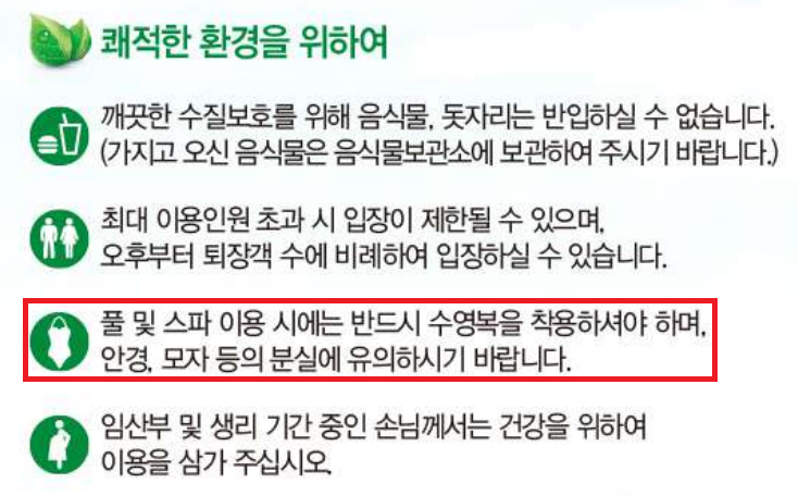 너무나도 상식적인 가이드이긴 하지만, 의외로 이걸 지키지 않으려는 사람들이 있다. 그냥 반팔 반바지를 입으면 되지 않냐고 물어보는 지식in 글들도 심심찮게 보이는 것이다. 수영복을 착용하는 이유는 물놀이에 맞는 TPO를 지키는 것이다. 다만, 최근 수영복의 종류가 워낙 다양하고 래시가드 역시 수영복에 해당되기 때문에 반바지 반팔티를 입지 말고 차라리 래시가드를 구매하자.