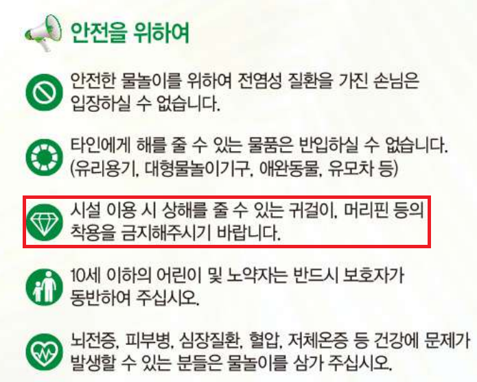 이런 액세서리는 물놀이 도중 땅에 떨어져도 빠르게 인식하기 어려운데, 문제는 캐리비안베이 내를 맨발로 다니는 사람들에게 치명적인 상해를 입힌다. 아주 상식적으로 행동하자. 하지 말라는 규칙은 하지 말도록 하자.