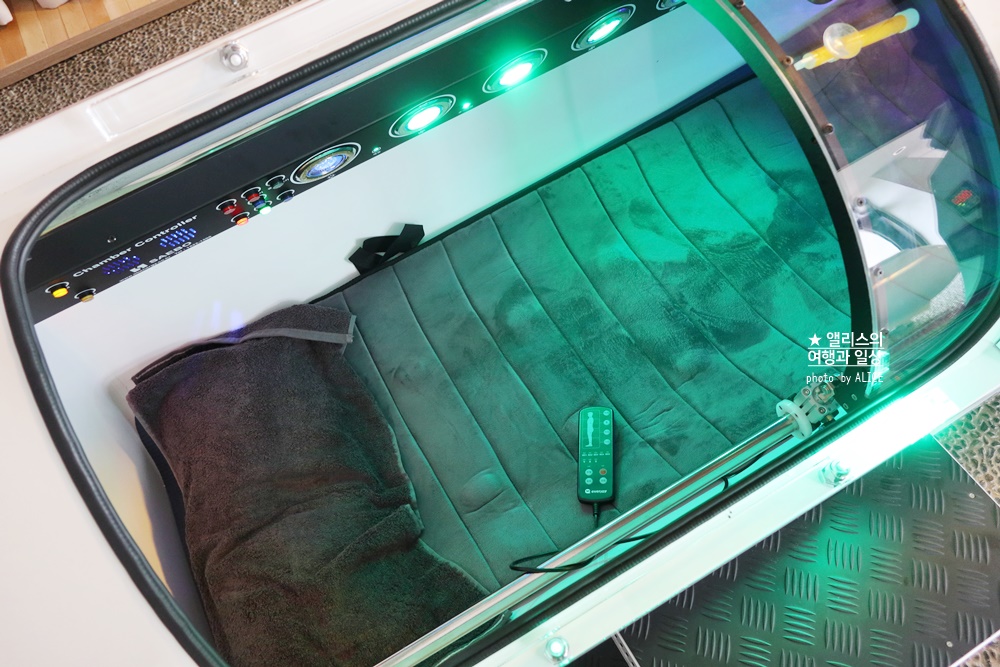 실제 고압산소캡슐은 강렬한 운동을 하는 운동선수들의 근육통을 빠르게 이완시키면서 풀어주는 데 탁월하여 많이 사용하기도 한다. 그렇다면 나도?! 강렬한 운동을 한 건 아니지만 하체 근육통이 꽤 남아있던터라 기대감을 슬쩍 안고 고압산소캡슐 안으로 들어갔다.