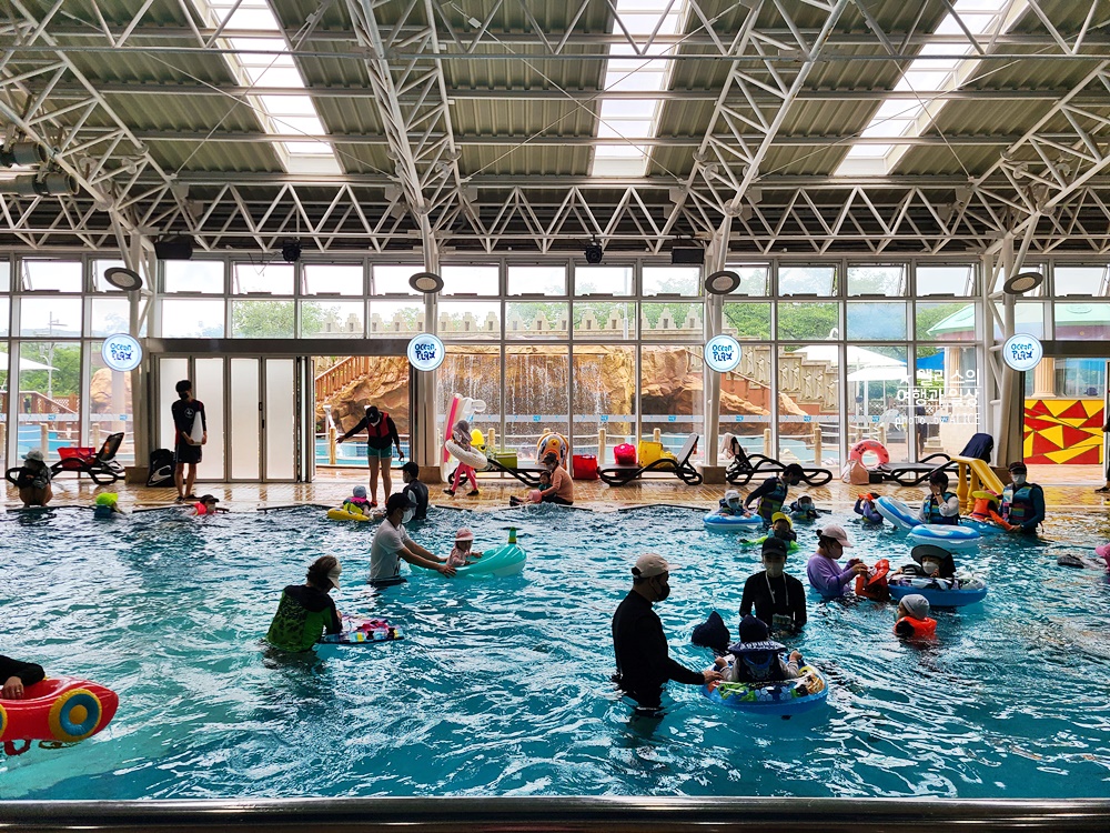실내존은 정말 사람이 많았다. 의외로 유아풀과 온천탕에는 사람이 거의 없었고 전부 바데풀에 몰려 있었다. 바데풀은 수심이 1m가 넘기 때문에 부모님과 아이들이 함께 하기에 안성맞춤이었다. 이곳에서는 가지고 온 튜브도 신나게 놀 수 있어서인지 모두 바데풀에 몰려있었다.