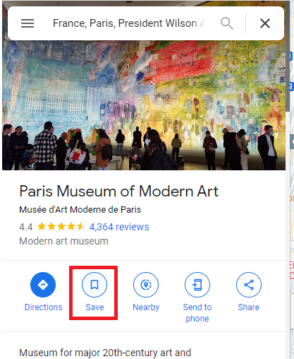 이렇게 지도에 표시가 되기 때문에 어떤 박물관/전시관/미술관/기념장소들이 몰려있는지 단 번에 알 수 있고 파리 뮤지엄 패스로 이동 가능한 동선을 자신 위 취향에 맞춰서 단번에 파악 가능하다! 게다가 각 장소를 이어서 Direction 이동 방법도 구글맵으로 실시간으로 정확하게 확인할 수 있다.