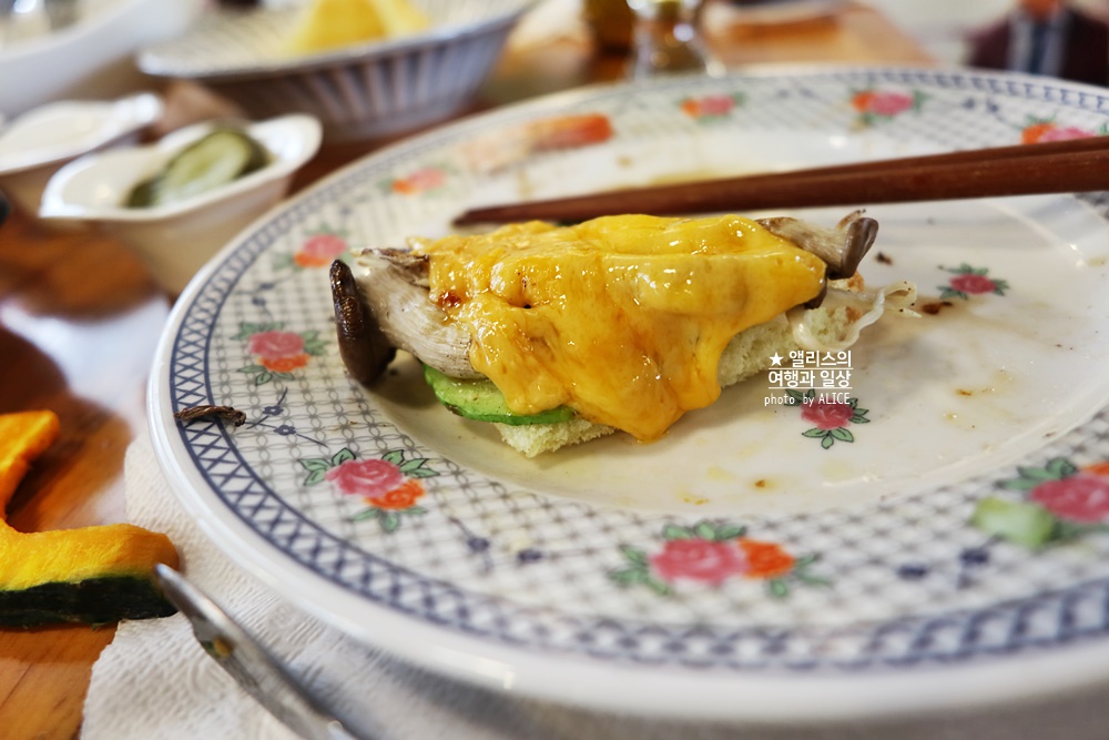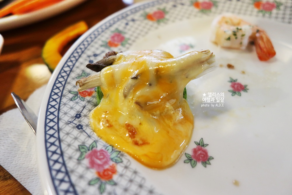 과일은 그냥 같이 먹으면 된다. 나머지 채소는 불판 위에 구우면 된다. 특히 베란다 치즈는 보다시피 다양한 채소를 구워 먹을 수 있어서 정말 좋았다.