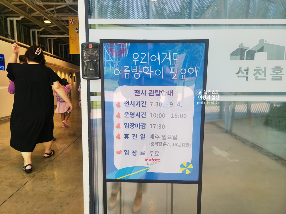 석천홀은 소리길(대나무숲길)에서 통해 걸으면 입구로 곧장 이동 가능하다. 석천홀에 입장하니 시원한 에어컨 바람과 함께 넓은 입구에서 "우리에게도 여름방학이 필요해"라는 전시의 안내사항을 확인할 수 있었다.