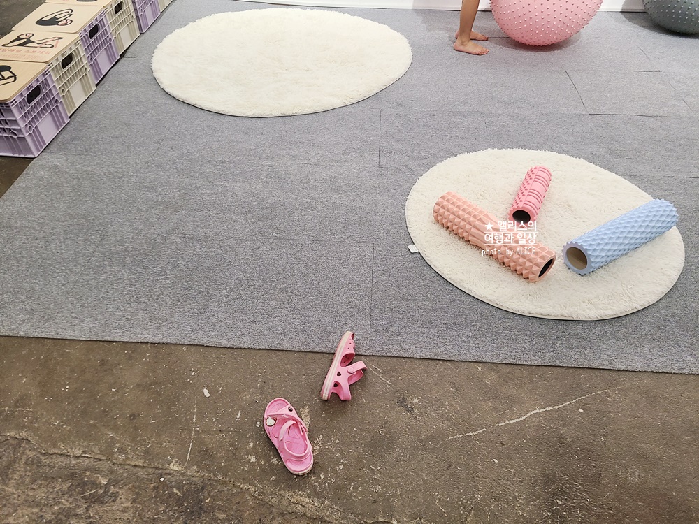 요가매트와 짐볼을 직접 이용해볼 수 있다.