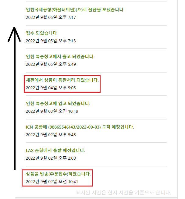 · 배송방식: 해외에서 물건 배송 → 항공이동 → 국내 도착 후 세관확인/신고 → 국내 배송업체 위탁(우체국 또는 CJ대한통운) → 개인 집까지 배송