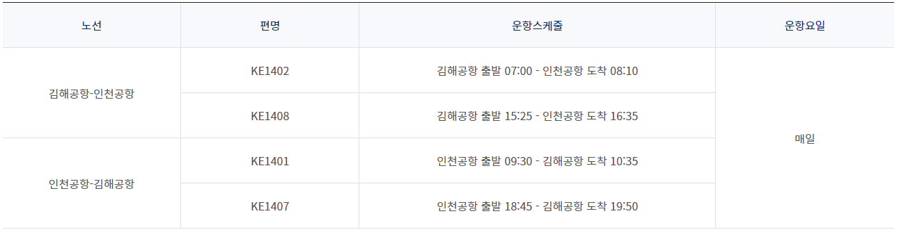 1. 김해공항 - 인천공항 국제선 연결 전용 내항기 스케줄
