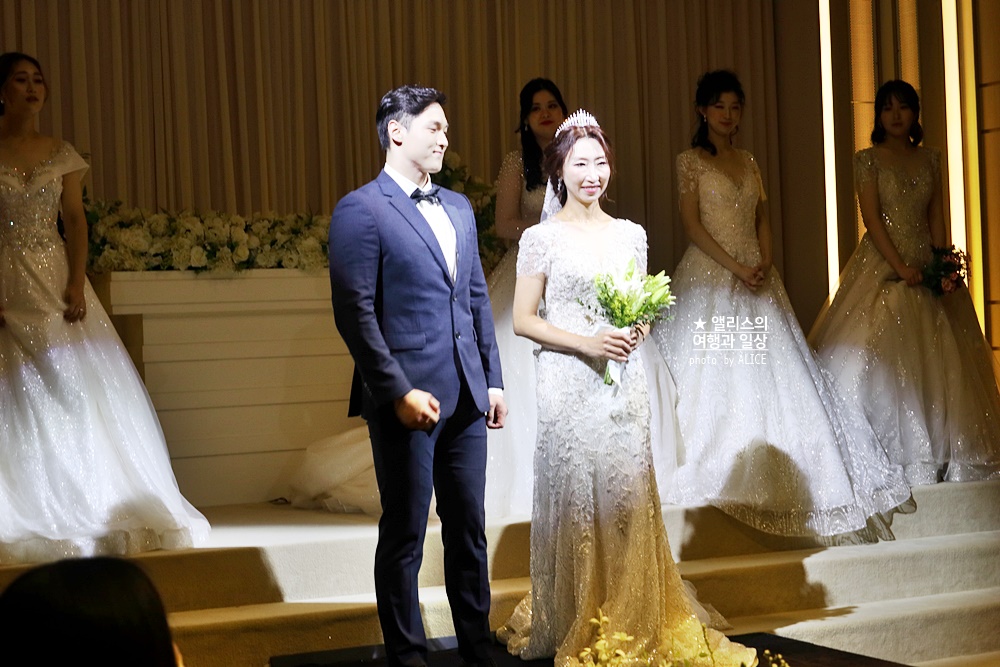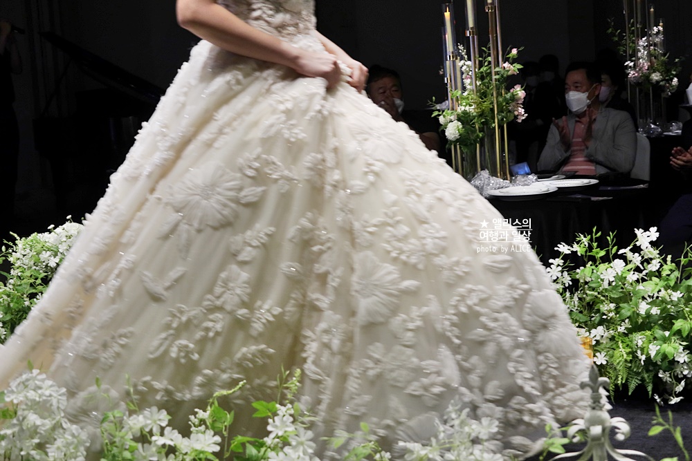 모델들이 직접 입고 버진로드를 걷고 신랑을 연기하는 모델과 함께 포즈를 취하면서 가까이서 웨딩 드레스의 디자인과 패턴등을 볼 수 있었다. 소재도 잘 보여서 어떤 드레스가 어떤 핏을 보여주는지도 가까이 볼 수 있었다. 덕분에 가장 많은 사람들이 카메라를 꺼내들었던 코너가 아니었나 싶다.