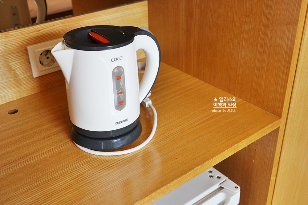 객실은 충분히 넓다. 보다시피 넓다. 그래서 여행가방을 대충 널부러지게 두어도 동선에 아무런 방해가 되지 않을 정도다. 그래서 마음에 든다. 더군다나 바닥은 깔끔하게 윤이 나는 마룻바닥이다. 이런 바닥은 슬리퍼가 없어도 걸어다니기 편하다. 전반적인 분위기가 마음에 들었던 호텔 객실!