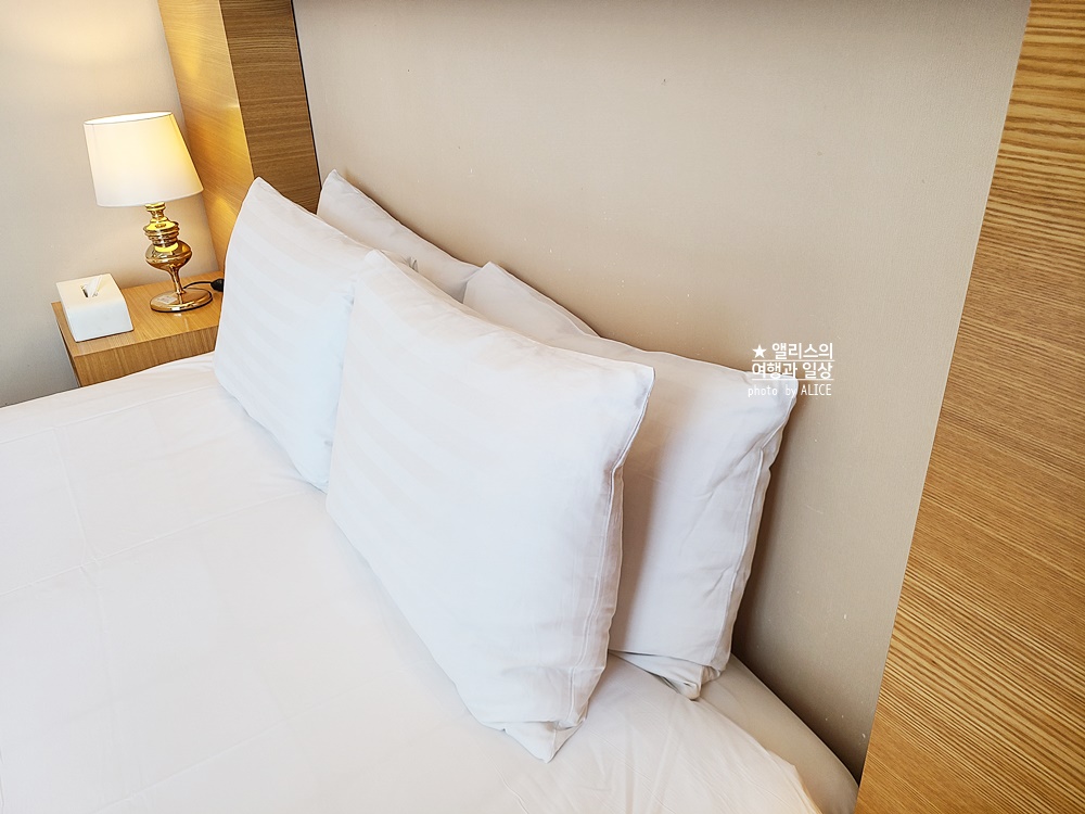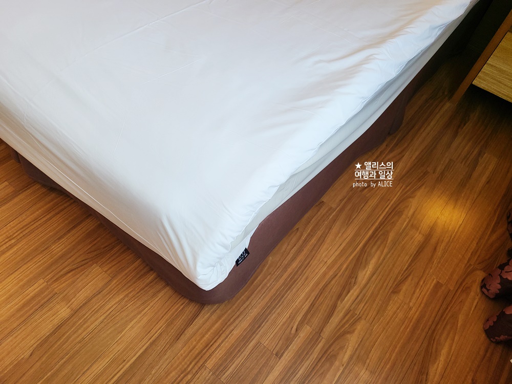 높은 편인 침대였는데 별도의 아무나 철제와 같은 프레임이 아닌 두툼하지만 탄력있는 프레임 위에 별도의 매트리스를 올려둔 두툼한 침대였다. 그리고 그 위에 제대로 각 잡힌 이불들을 보니 이 호텔은 깔끔하게 관리하려고 상당히 노력하다는 것이 슬쩍 엿보이는 느낌이었다.