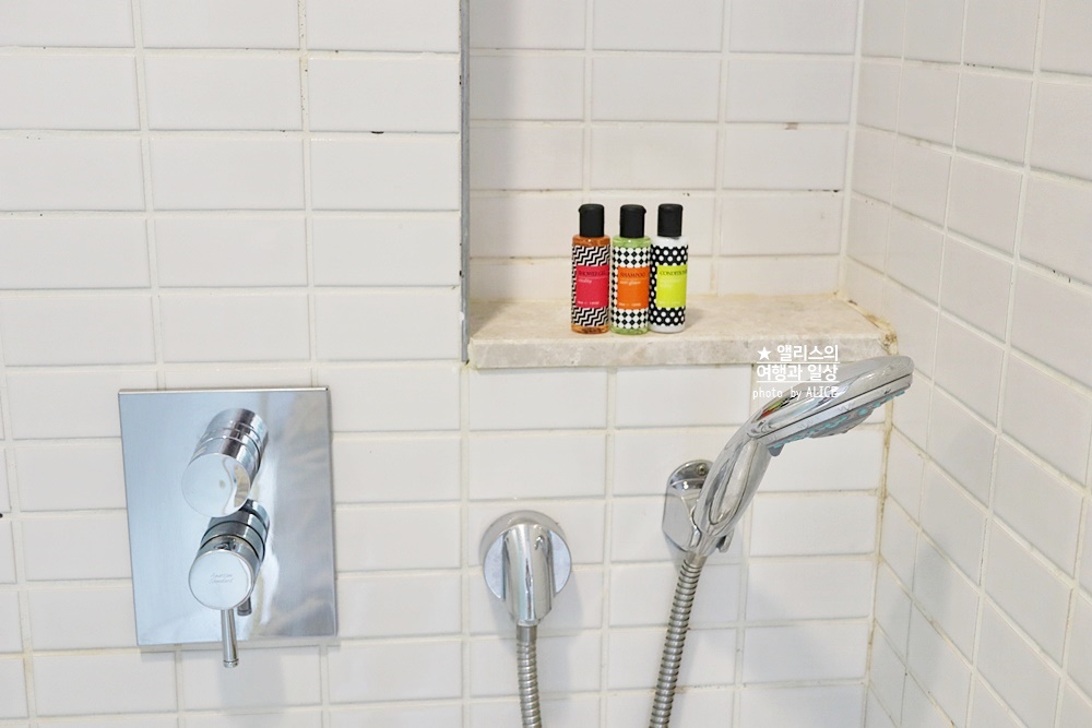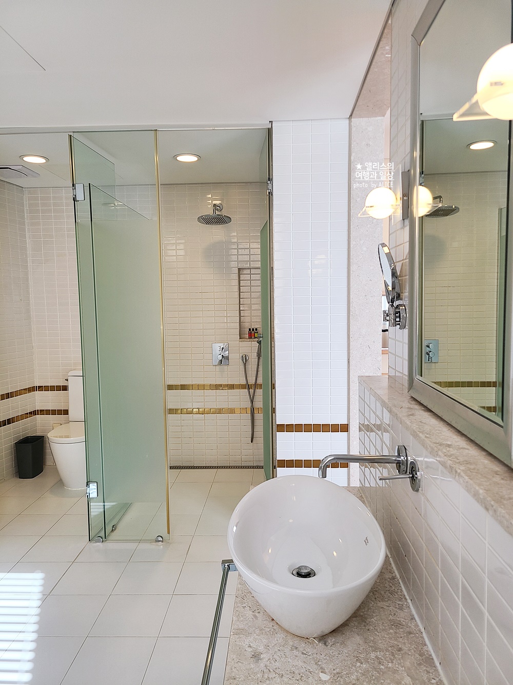 대형 샤워헤드는 매립형으로 되어있고 별도의 개별 샤워헤드가 있다. 그리고 샤워실은 공간이 넉넉한 편이라 이용하기 편리하다.