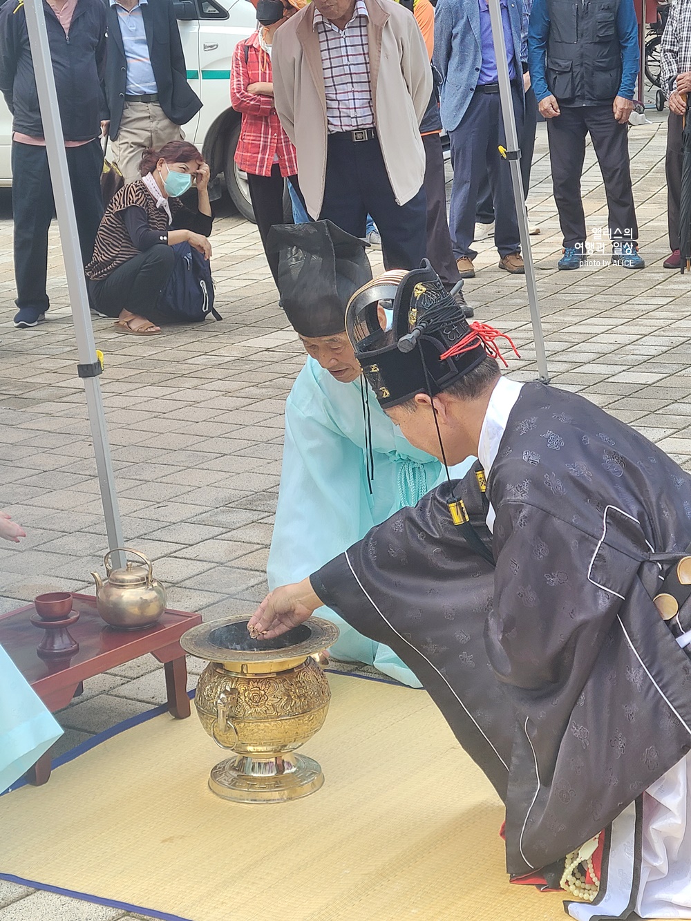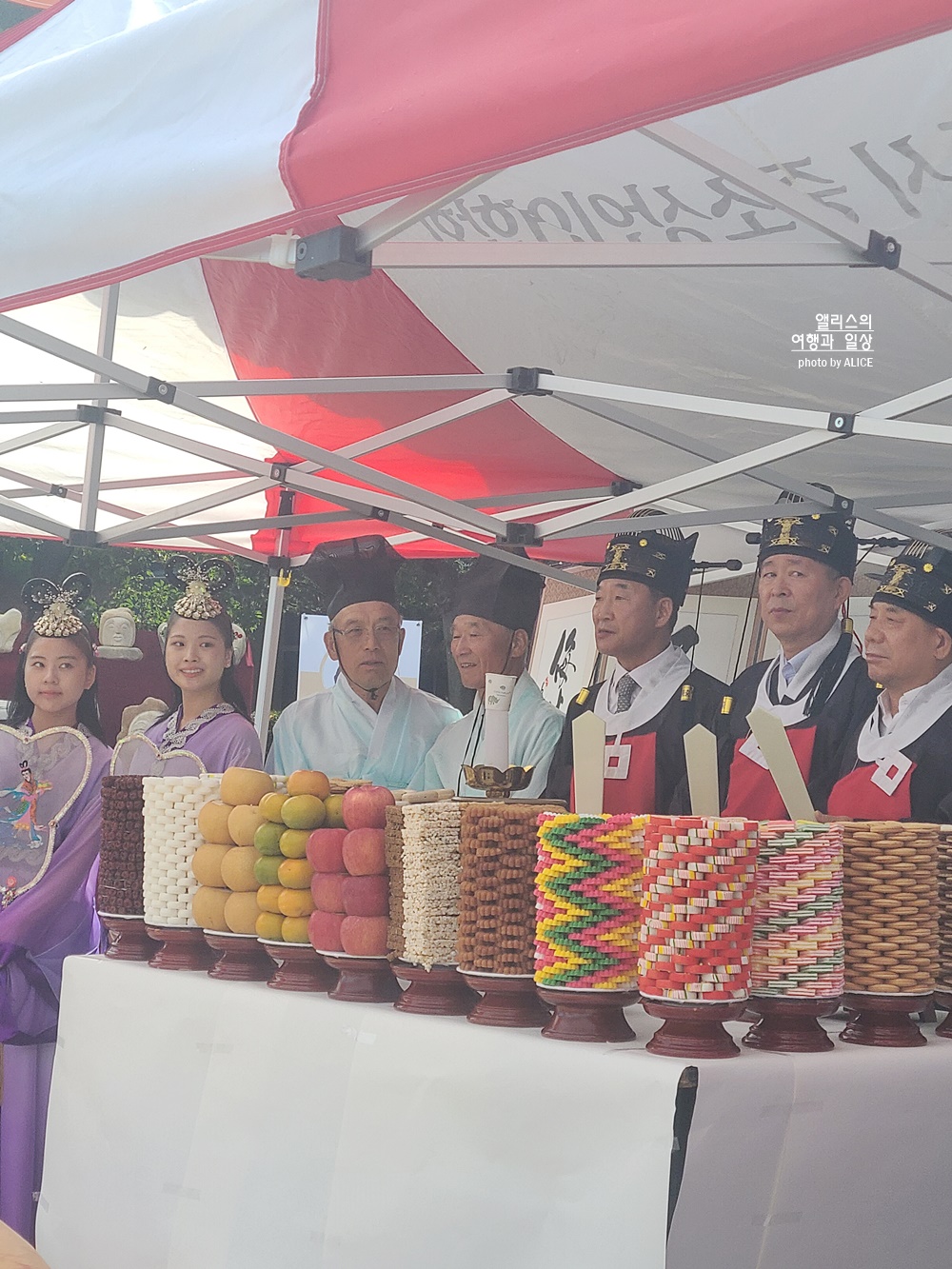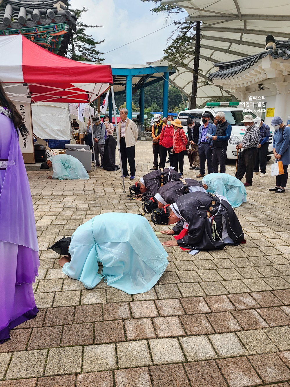 이런 행사를 처음 봐서 모든 것이 신기방기 했다. 보라색 옷을 입은 분들의 역할이 궁금했는데 지나가면서 들린 말은 선녀들이 온정수신제를 기다리고 있는 것이라고.
