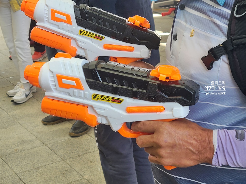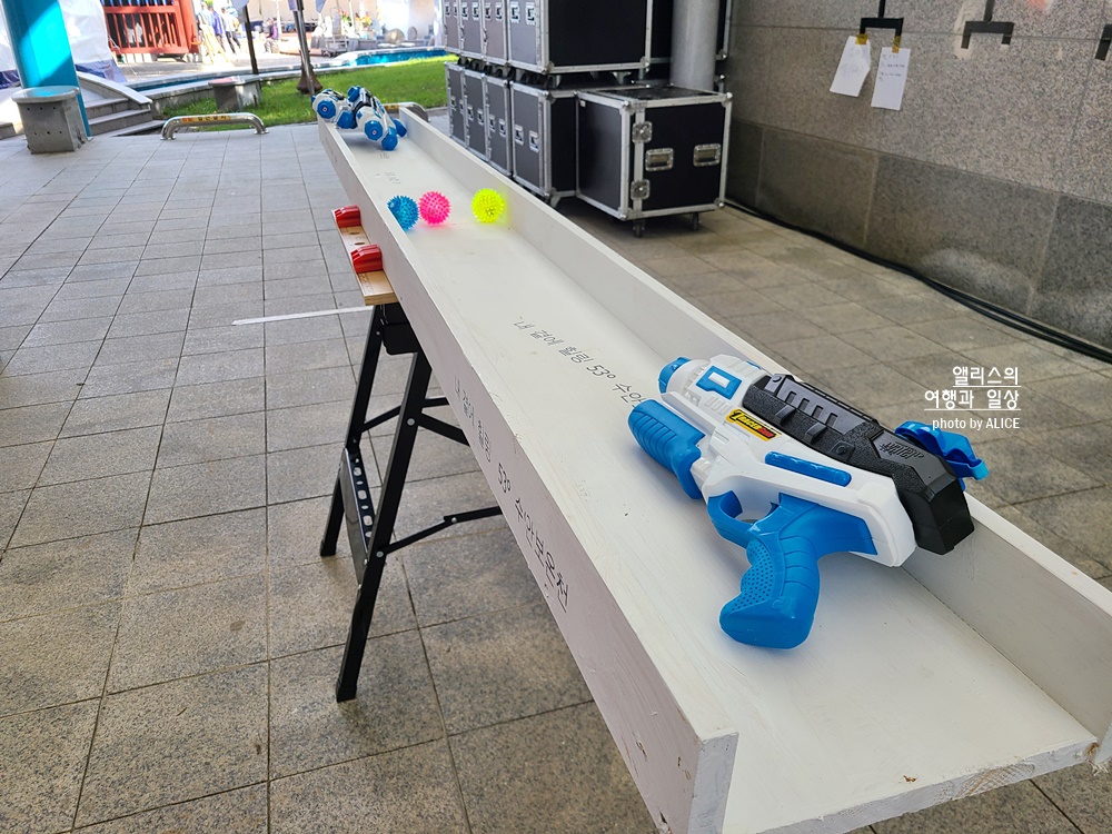 이 물총이 그냥 쏜다고 나오기는 해도 힘이 없기 때문에 힘 있는 물줄기를 분사하려면 펌핑을 엄청해야 한다 양쪽에서 게임하시는 분들이 엄청나게 빠른 속도로 펌핑 엄청 하고 다시 부지런히 물을 쏘고! 서로 물난리가 좀 나기는 했지만(ㅋㅋㅋ) 정말 혼신을 다해서 상대편으로 공을 넘기는 모습이 구경하는 사람들도 재미있어했다.