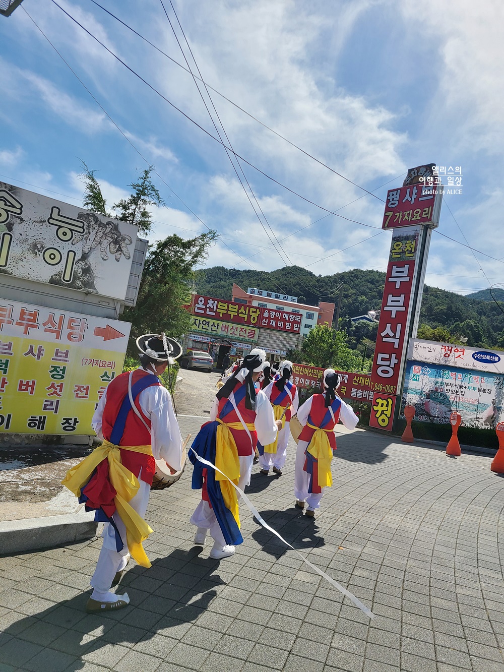 수안보 온천제 첫째 날 풍물단이 마을을 돌며 온천제의 시작을 알린다. 이후 산신제가 오후에 시작되는데 이 날따라 산신제가 먼저 시작되어 스케줄이 변경되어 이 부분을 확인할 수 없어서 아쉽게도 산신제를 볼 수는 없었다. 그래도 오후에 있는 취수제와 온전수신제를 볼 수 있어서 좋았다.