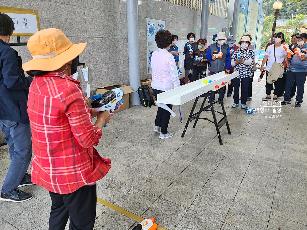 50세 이상의 어르신들이 참여하는 게임이다. 물이 가득한 물총을 이용해서 상대방에게 작은 공 3개를 겨냥해서 넘기는 게임이다. 즉, 양쪽에 동시에 물총을 쏘면서 중간에 있는 세 개의 공을 상대편으로 넘기면 되는 단순한 게임인데 아주 인기가 많기도 했고 재미있기도 했다!!