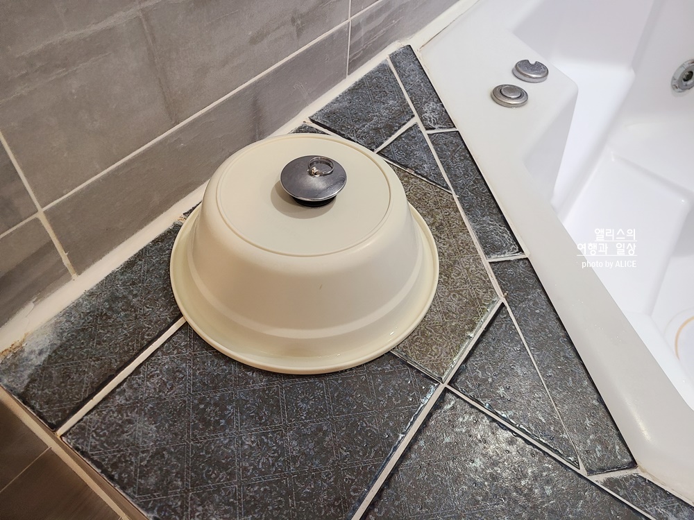 엄청 크고 넓은 스파 욕조가 딱! 근데 문제는 욕실 자체가 워낙 좁아서 이 커다란 스파 욕조가 있다 보니 나머지 공가니 너~~ 무 좁아지는 것이다. 뭐, 온천이 목적이고 프라이빗하게 수안보 온천을 즐기는 게 목적이라 큰 문제는 없지만 세수할 때 너무나 불편했다.