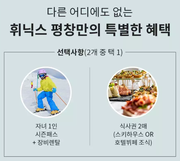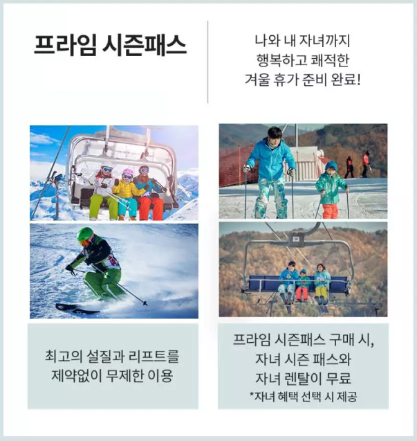 휘닉스 평창 22/23 프라임 시즌패스69% 할인 스키 리프트 장비 렌탈 또는 식사권 포함