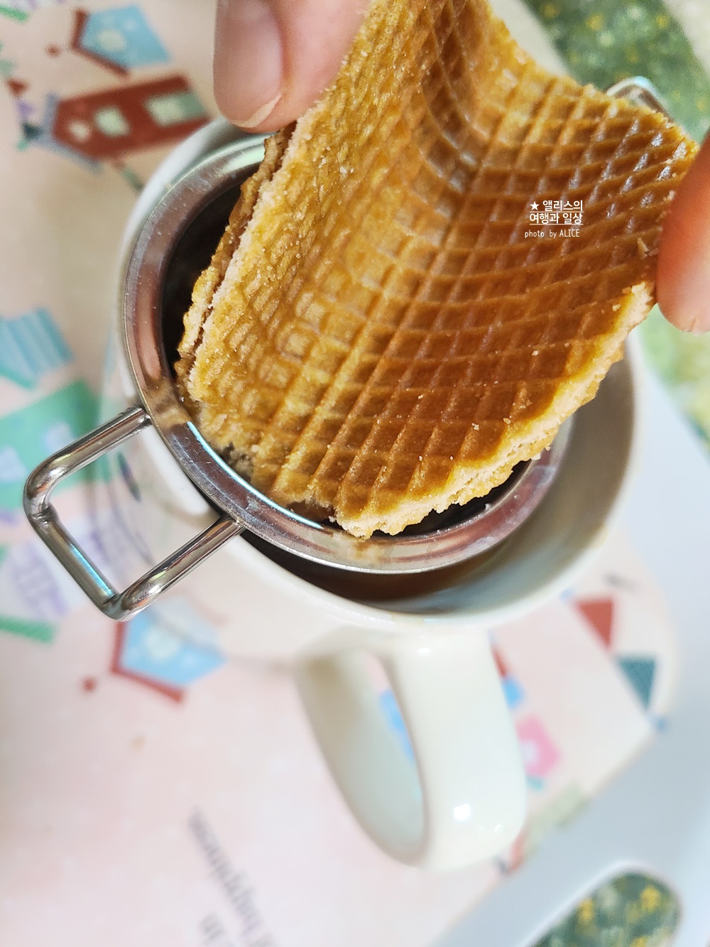 이 와플을 맛있게 먹는 방법은 아주 간단하다. 김이 나는 컵 위에 스트룹와플을 올려 두면 된다.