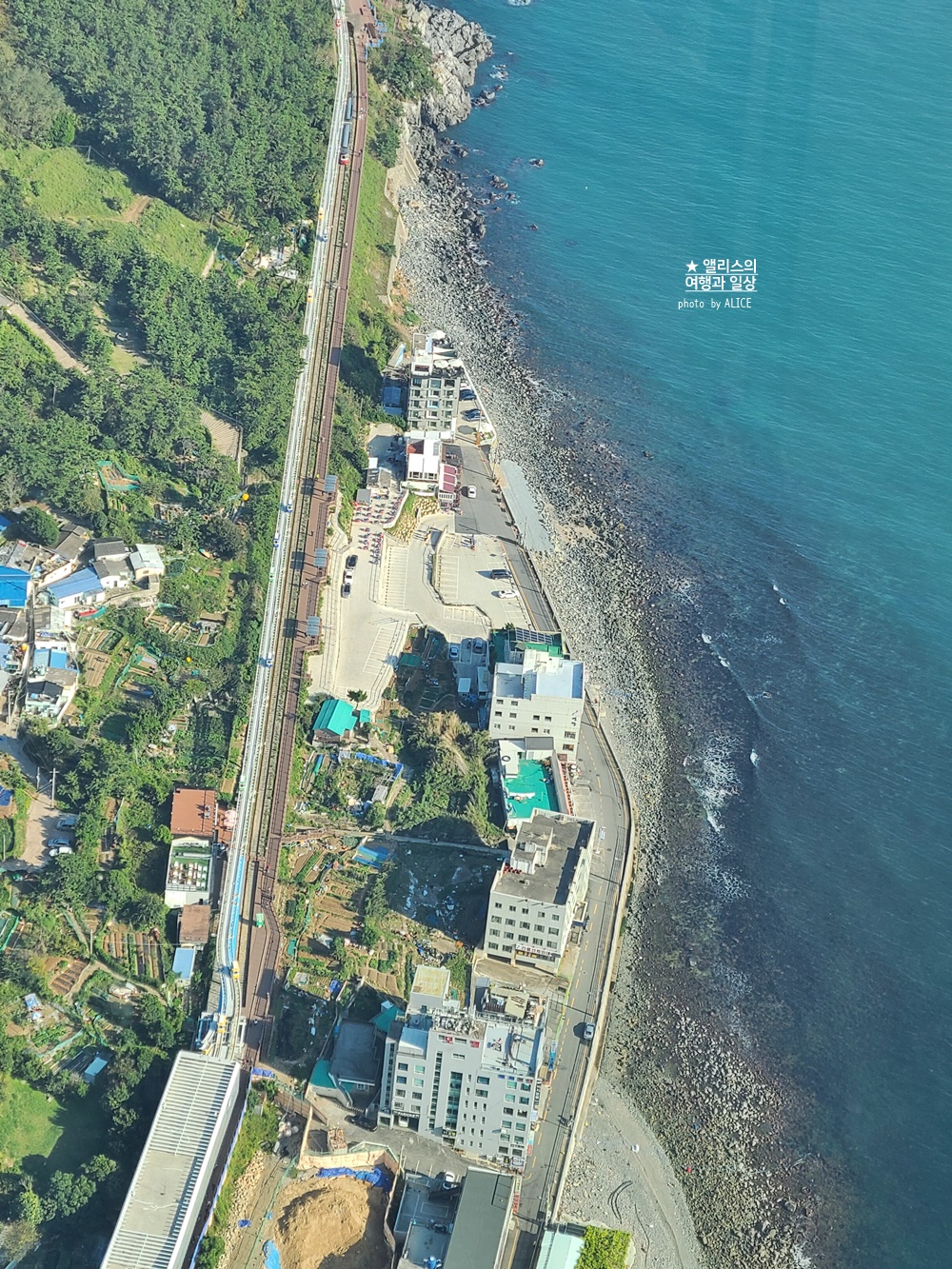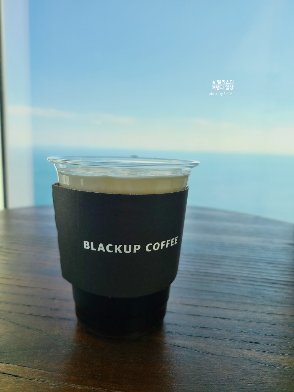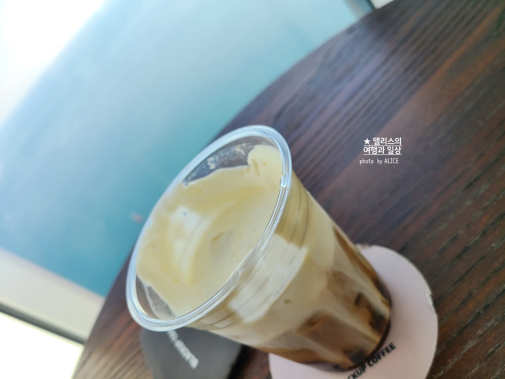 스타벅스에서 주문한 테이크아웃 메뉴 챙겨들고 블랙업 커피 매장에 와서 오션뷰 사진을 찍는다.