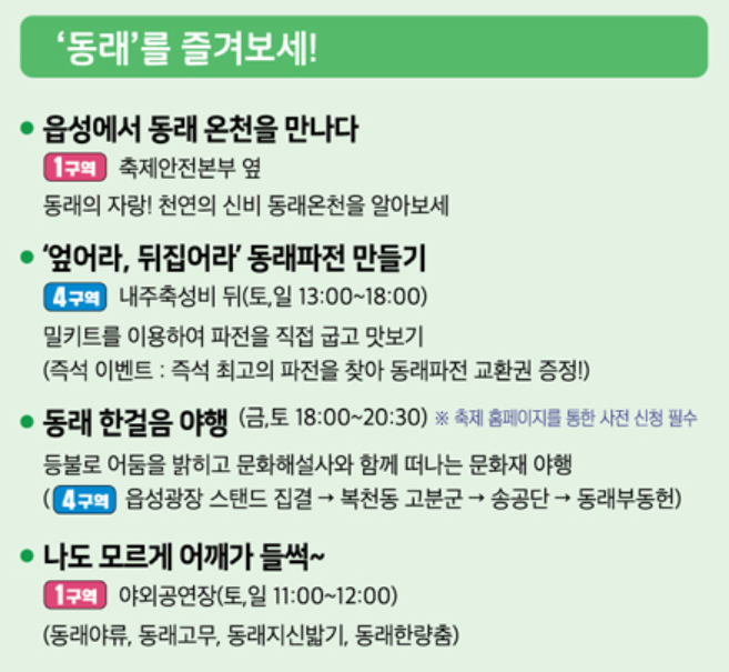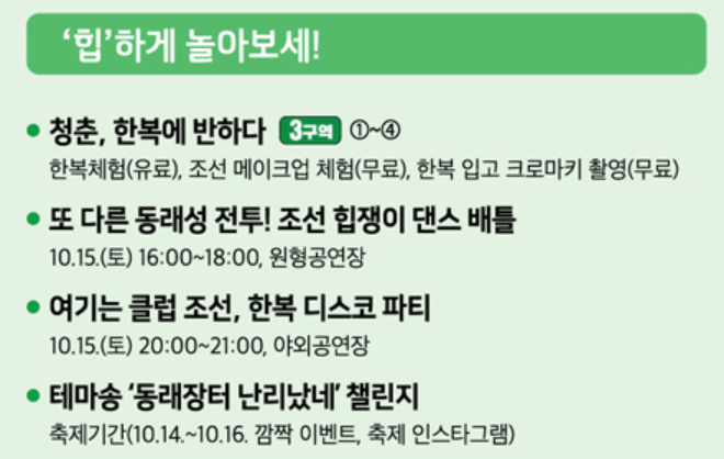 · 주요행사: 10.14 동래부사행차 길놀이, 불꽃쇼 / 10.15 동래 세가닥 줄다리기 / 2일간 진행되는 동래장터체험, 동래성 전투재현 뮤지컬 '외로운 성'