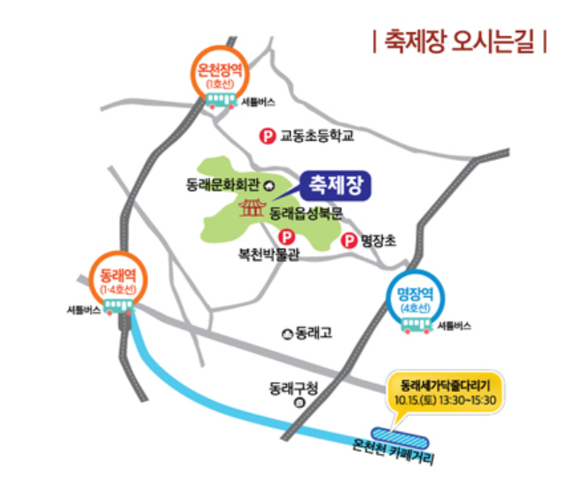 ▶ 동래역 (4번출구), 온천장역(1번출구), 명장역(3번출구)에서 오가는 축제 셔틀버스(마을버스)가 있으니 이걸 반드시 이용하자.