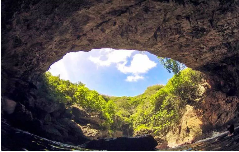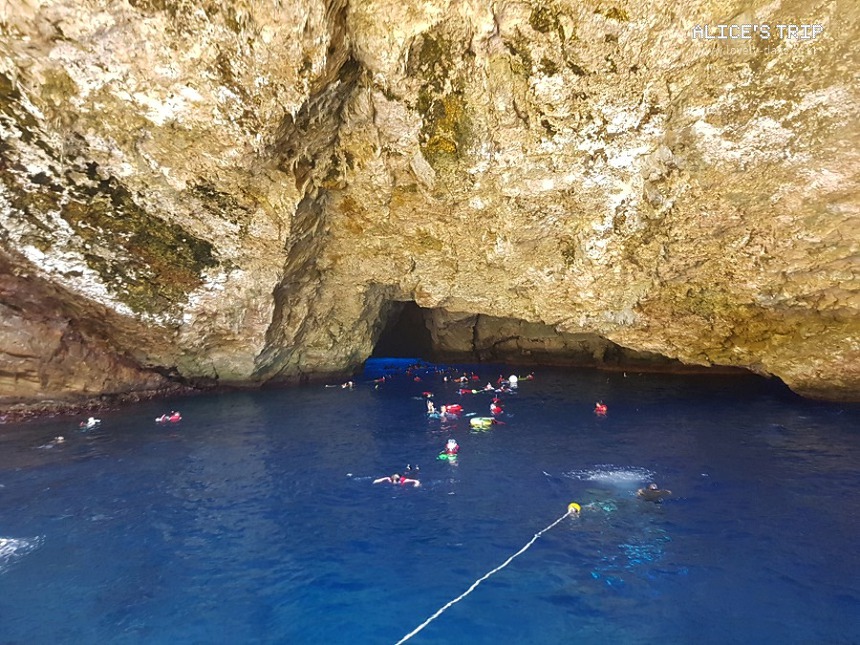 굴 사이로 엿보이는 푸른 물빛만 보아도 왜 이곳이 그렇게 사랑 받는지 알 만하다. 말로 표현하기 힘든 아름다운 물빛이 동굴 안을 신비롭게 채우고 있다. 물 속으로 들어가면 세 개의 터널이 있는데, 그 사이로 햇살이 쏟아지면 그야말로 환상적인 물빛을 볼 수 있고 스노클링도 가능하다.