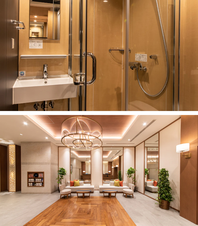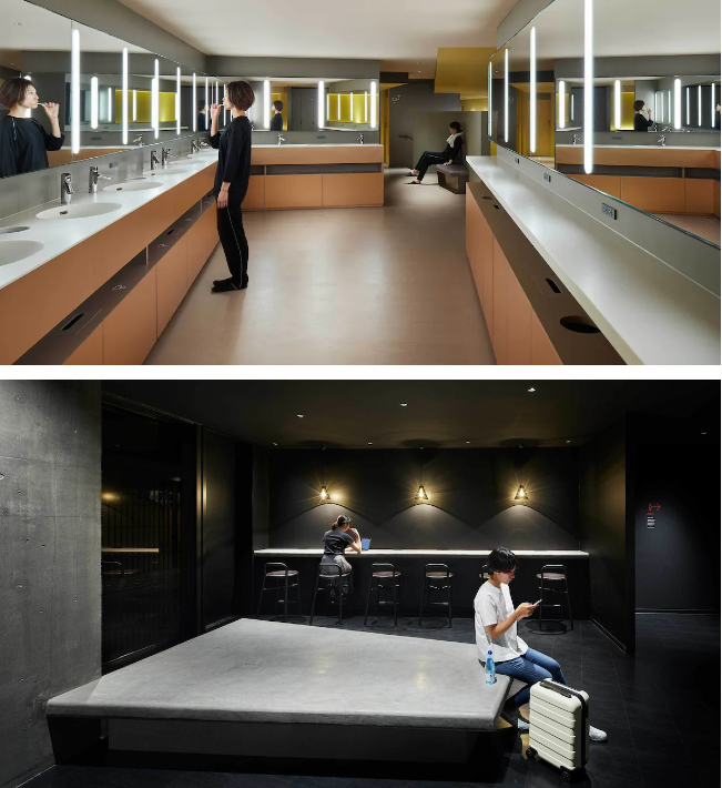 1,2층에 라운지바가 있고 샤워시설과 화장실이 분리되어있고 깔끔하다. 전체적으로 깨끗하고 매우 고급스러운 분위기이며 일반 캡슐호텔과는 다른 분위기를 느낄 수 있다.