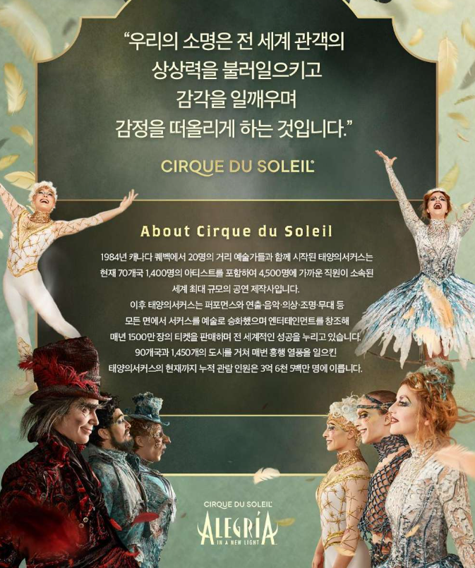 계적인 아트 서커스 그룹 '태양의서커스'의 상징적인 작품이자 전 세계 40개국, 255개 도시에서 1400만명 이상의 관객이 선택한 가장 사랑받는 작품인 '태양의서커스 뉴 알레그리아'