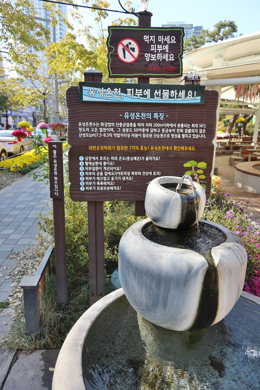 유성온천공원내에 있는 족욕체험장에 가면 유성온천 원수를 경험해볼 수 있다. 음용수로는 부적절하지만 직접 만져보거나 손을 담가볼 수 있다. 실제 유성온천 원수이고 누구나 경험해볼 수 있으니 족욕할 여유가 없다면 수욕(手浴)이라고 꼭 해보시길 추천~