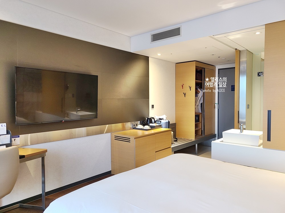 실제 사진보다 객실이 넓었다. 객실에 들어서자마자 내가 느꼈던 가장 기분 좋은 느낌은 바로 공간의 넓이. 별도의 소파가 있다는 점과 침실과 건식세면대의 공간이 분리가 완벽하게 분리되어있는데도 입구부터 전반적인 객실이 넉넉한 것이 무척 마음에 들었다.